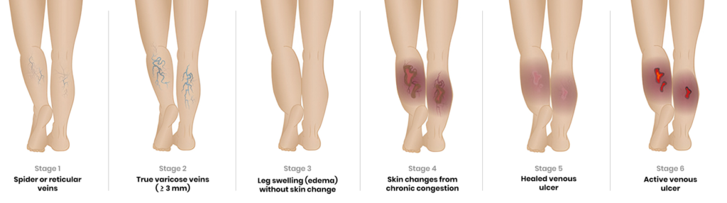 Varicose veins progress through clinical stages (CEAP classification):